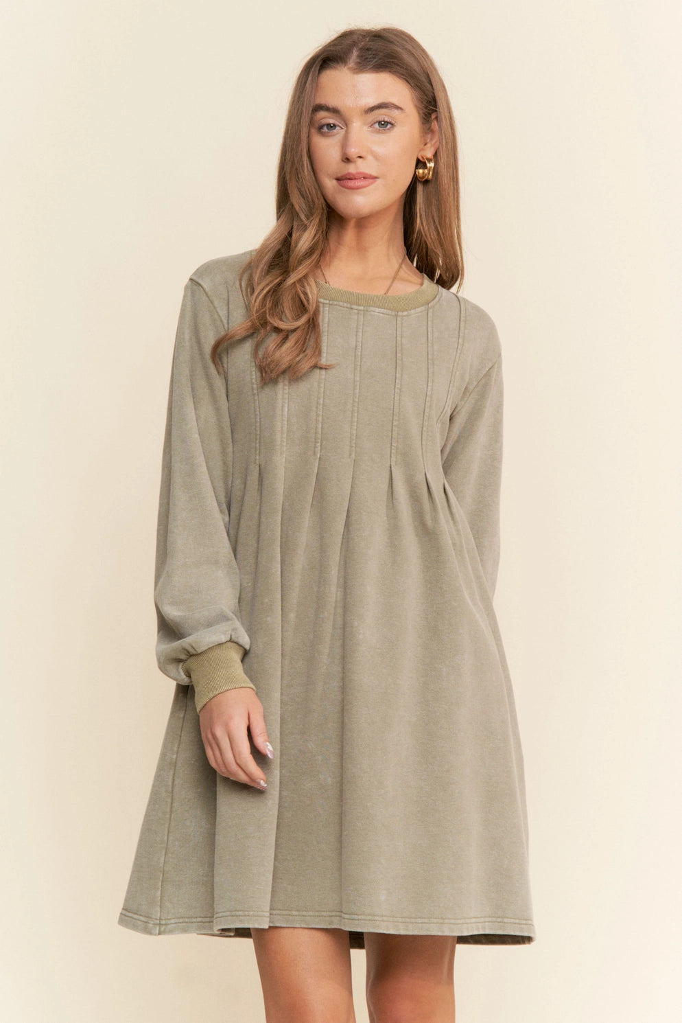 Moss Green Pleated Round Neck Long Sleeve Sweater Dress
